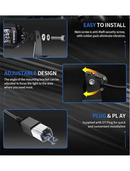Grâce à ses caractéristiques lumineuses, en particulier, l'uniformité de l'éclairage et la largeur du faisceau, cette lampe frontale est idéale pour une installation comme éclairage supplémentaire sur les SUV et les VTT . La plage de tension commune à tous les phares Aurora est de 9-36V et la température de fonctionnement est de -40° à + 155°С permet à ce modèle d'être installé sur la plus large gamme d'équipement.
